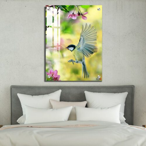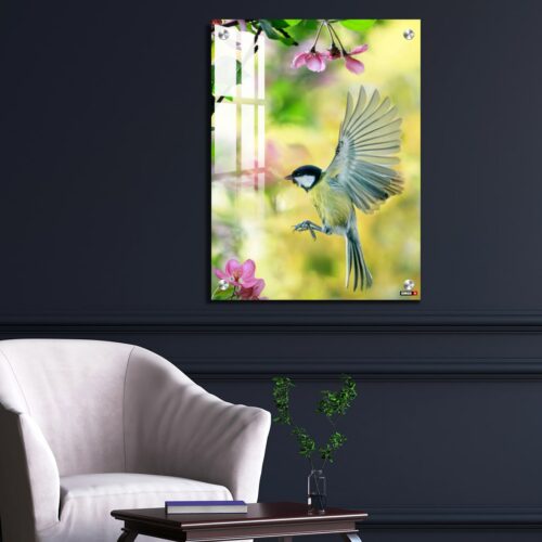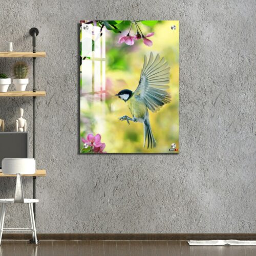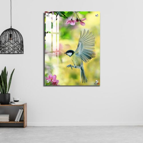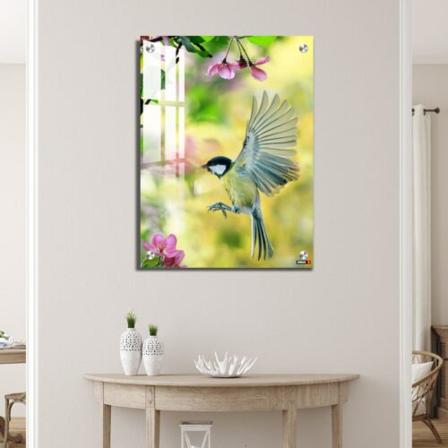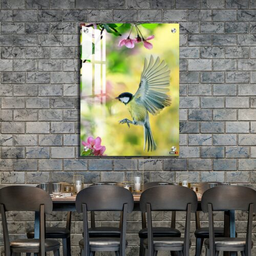 Acrylic Wall Decor – Bird Tit Flutters in a Sunny Spring Garden Among Pink Apple Blossoms